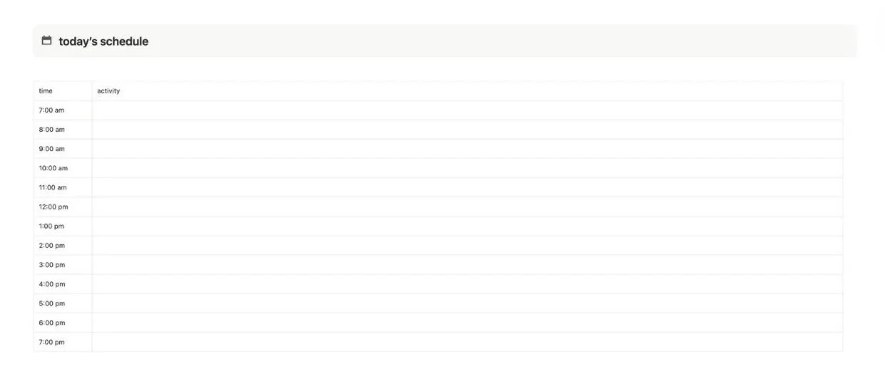 Feel free to change the times or time increments (for example, having boxes for every half hour instead of every hour). You can also add more boxes by mousing over the bottom of the table and clicking the plus icon. To remove boxes, simply highlight the ones you want to remove and press “delete” or click the trash can icon in Notion.