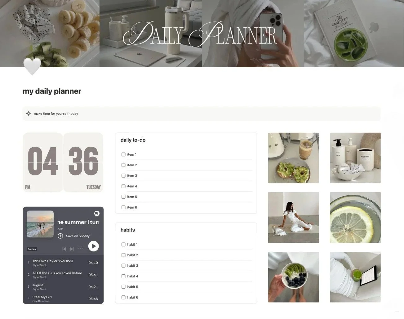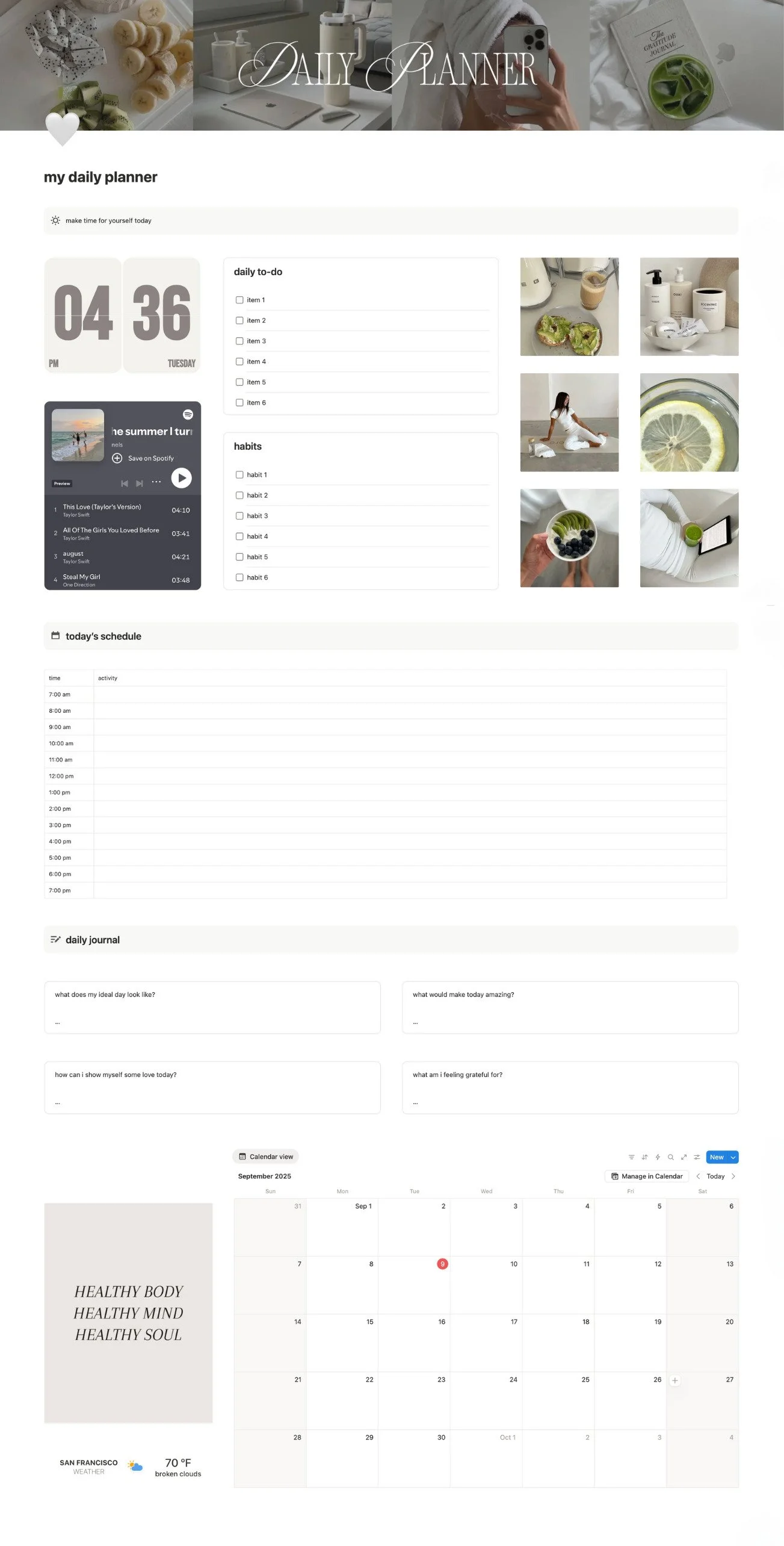 In this section we also have spots write your daily to-do list and habits you want to stay on top of. Next to that we have a little mood board section - how cute is this? I’m in love with the minimal, health-inspired aesthetic I curated for this notion template but the best part is you can swap these out with your own images if you want.